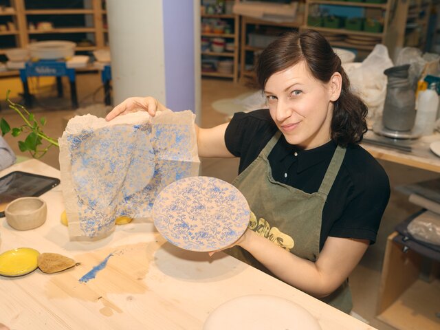 We’ll guide you through each step — from rolling and shaping to painting your piece with blue underglaze decals right on the spot.