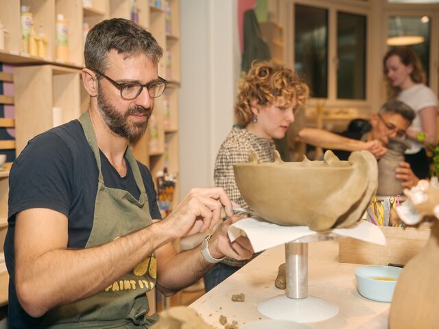 We offer a wide range of creative formats: Events, workshops, multi-day courses, studio classes and open studios. We offer programmes for all levels - from beginner to advanced. You can work with clay, paint ceramics, discover porcelain or try your hand at handbuilding, wheel throwing or glazing. There's something for everyone - come along and find your flow!