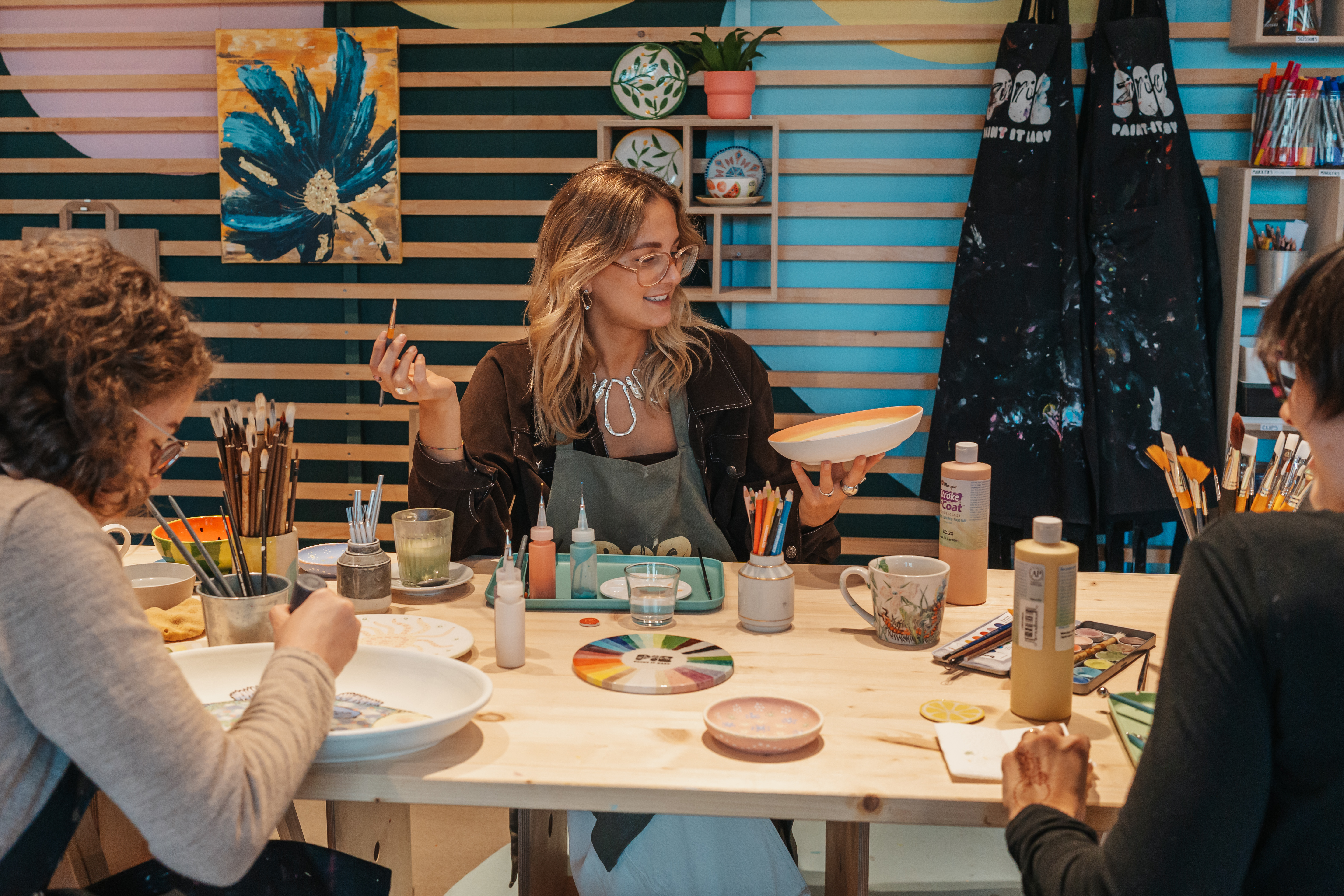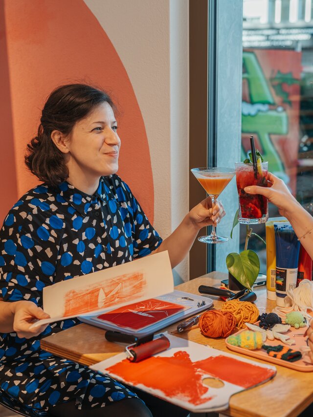 Die meisten Events finden in unseren wunderschönen, gemütlichen Studios statt – bunt, inspirierend und voller guter Vibes. Manchmal sind wir auch zu Gast in Bars, Restaurants oder im Sommer an schönen Outdoor-Locations.