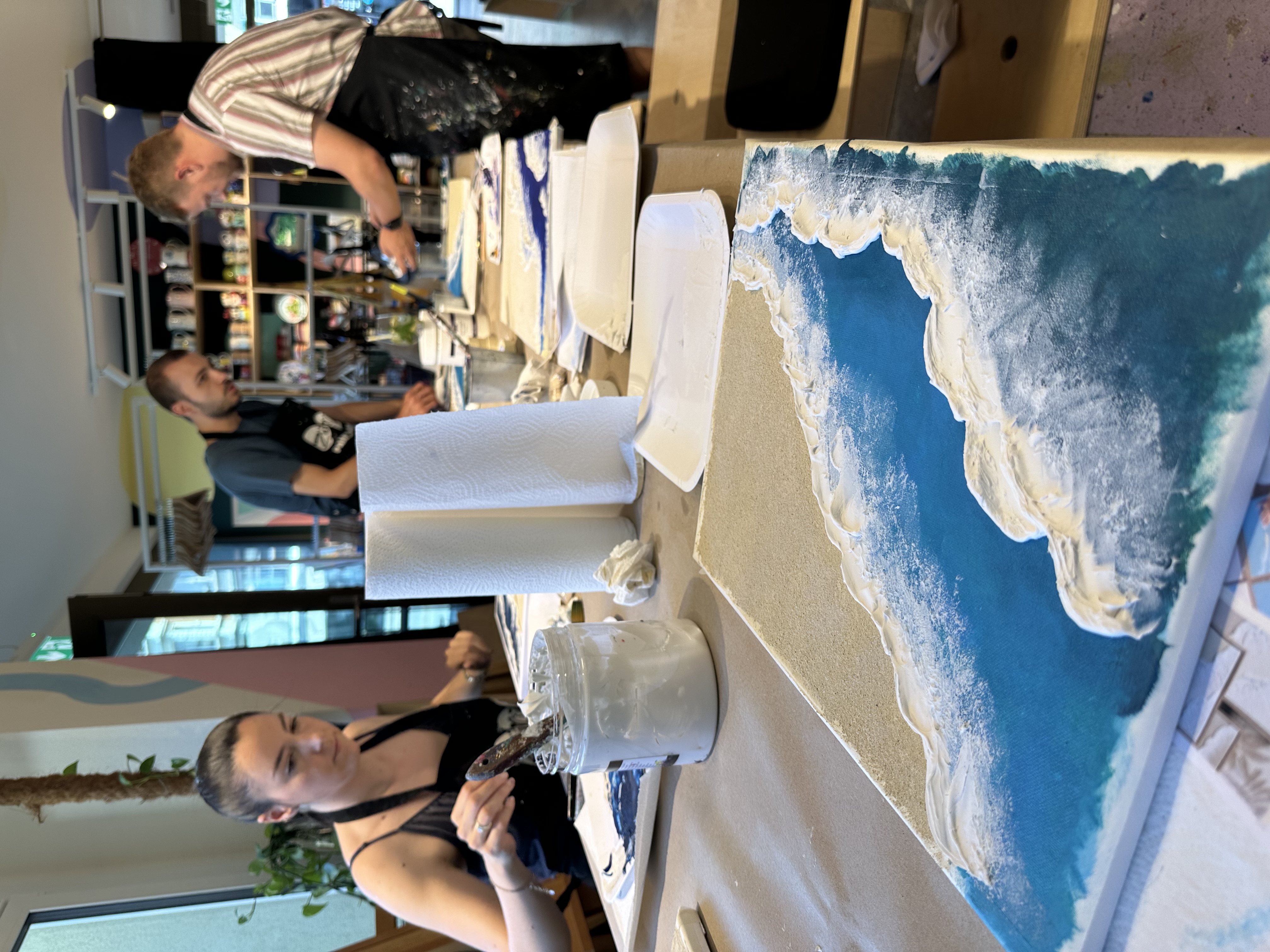 Ihr malt jeweils auf einer eigenen Leinwand – aber das Motiv ist auf beide aufgeteilt. Zusammengefügt ergeben die Bilder ein stimmiges Ganzes – wie zwei Hälften, die sich perfekt ergänzen.