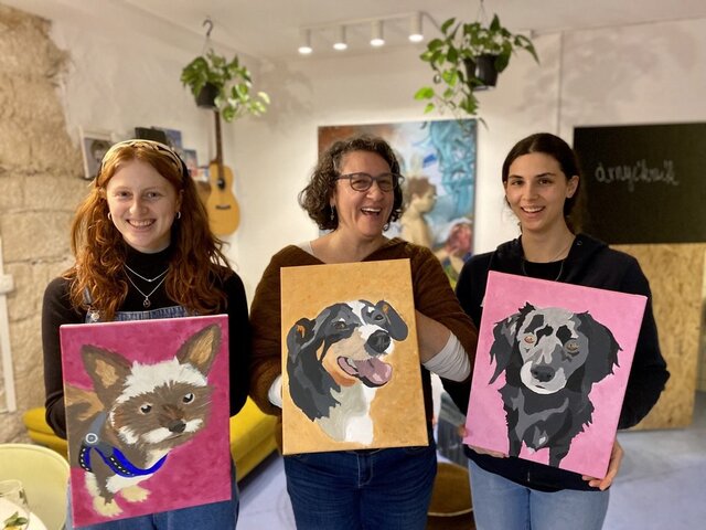 Ihr malt jeweils auf einer eigenen Leinwand – aber das Motiv ist auf beide aufgeteilt. Zusammengefügt ergeben die Bilder ein stimmiges Ganzes – wie zwei Hälften, die sich perfekt ergänzen.