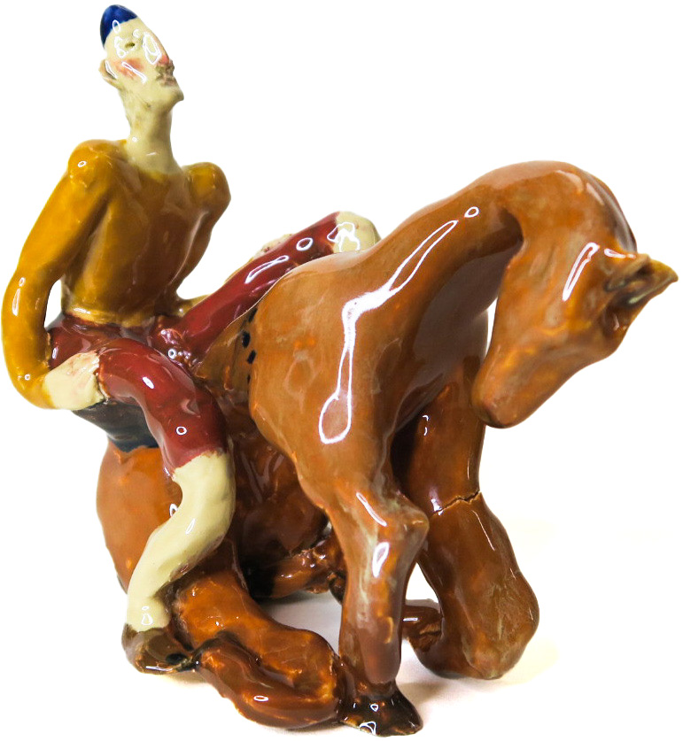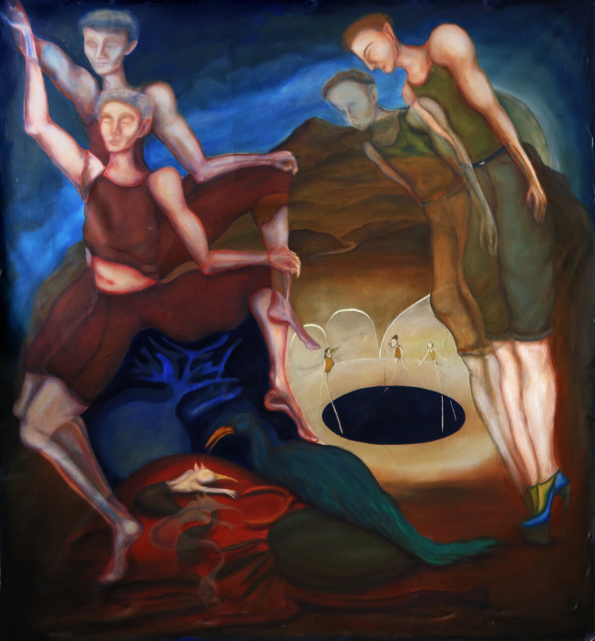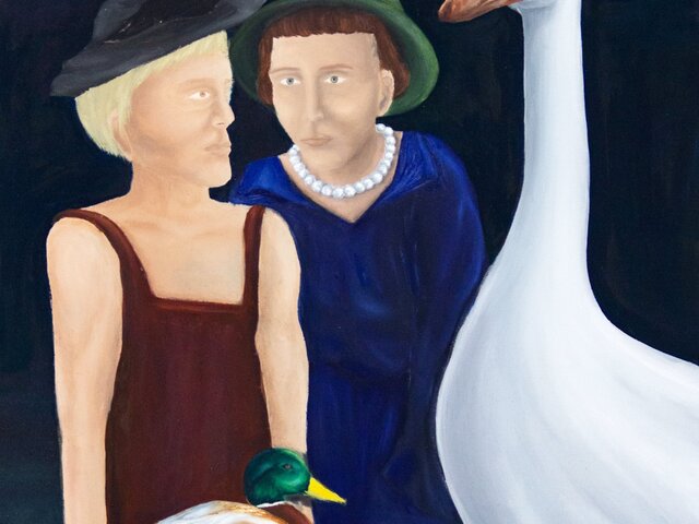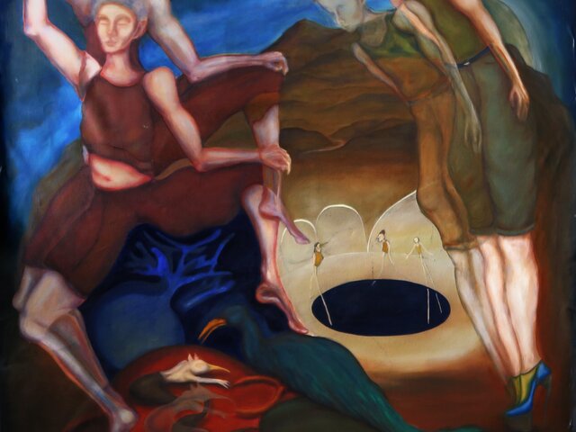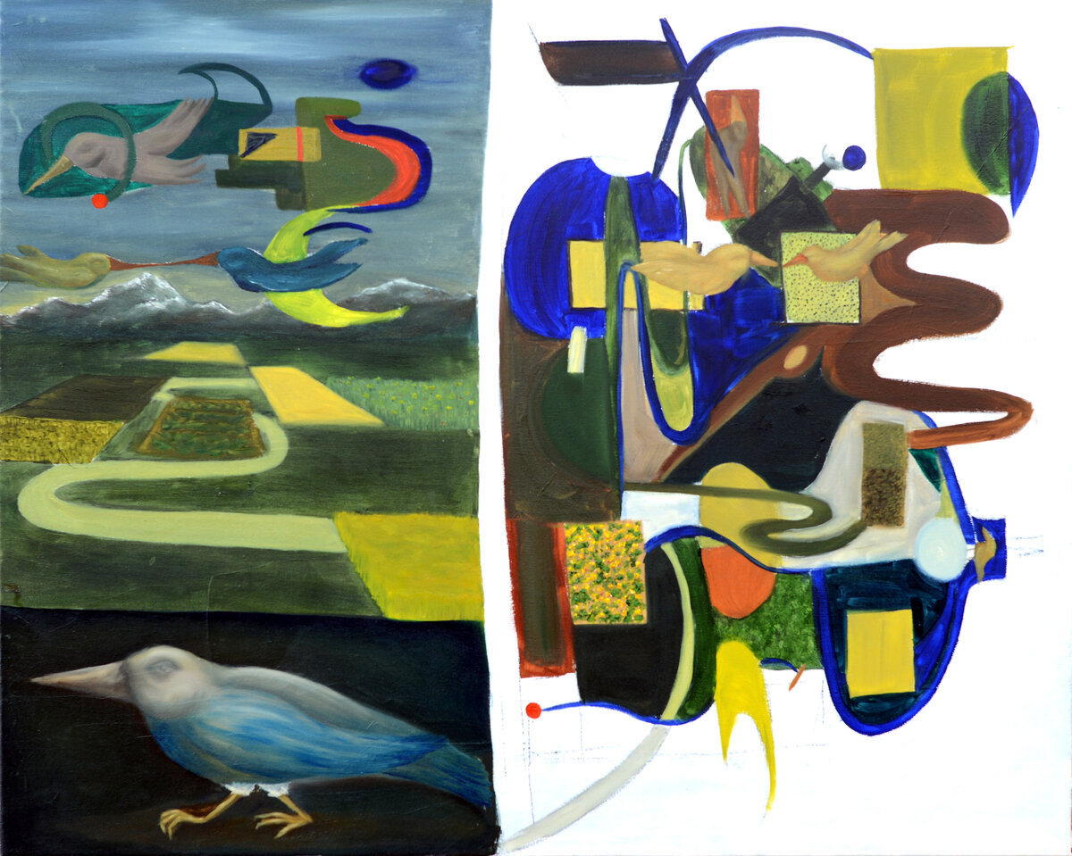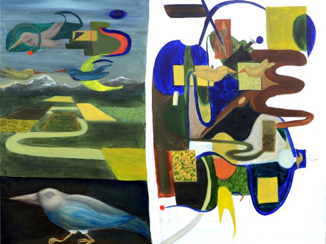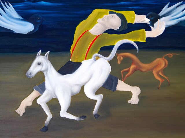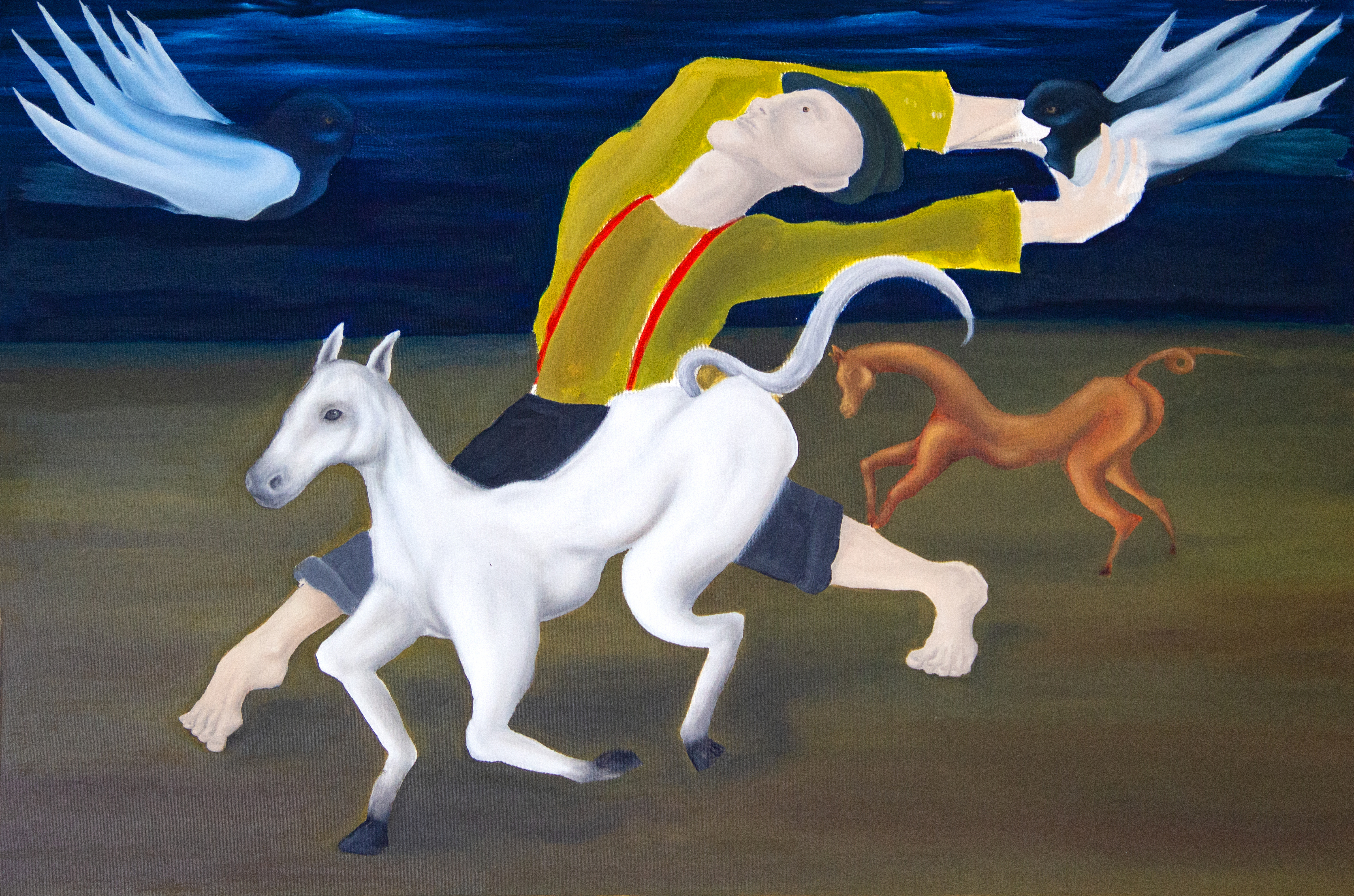 «In my paintings reality changes and manifests itself in absurd ways full of rolling landscapes, prairies and circus-like scenery inhabited by whimsical figures and birds. Human, animal and landscape share a new sphere that is to be opened up anew for all who enter it.»