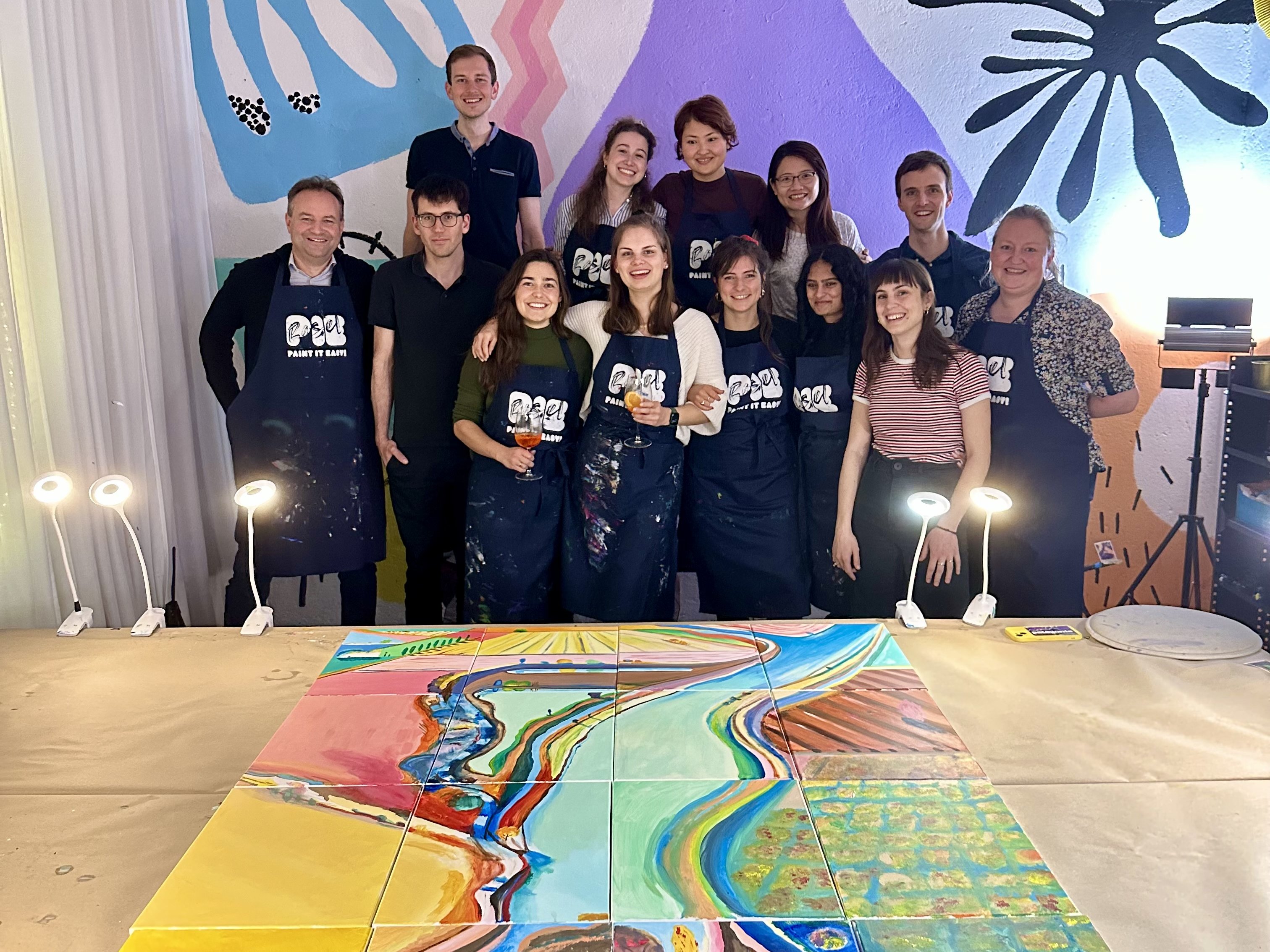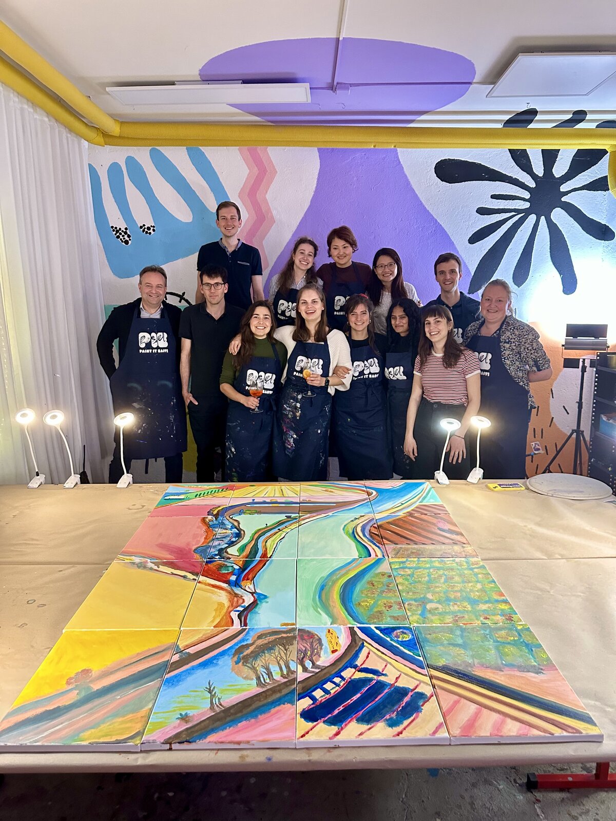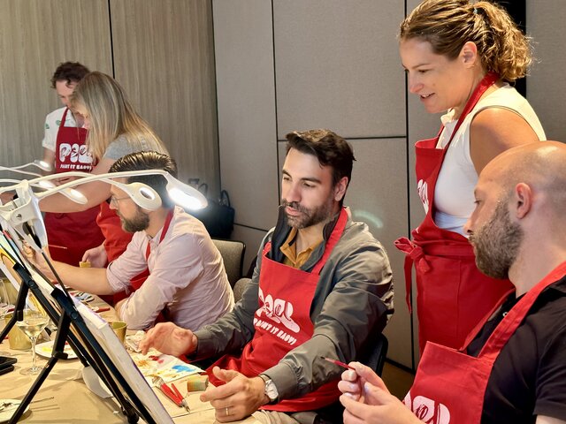 Am Veranstaltungstag bringen wir alle benötigten Malmaterialien zum Veranstaltungsort und bereitet alles vor. Der Kursleitung gibt zunächst einen Überblick über die Materialien und zeigt, wie alles funktioner. Auf Wunsch unterstützt wir auch bei der Gestaltung einer Komposition und einer harmonischen Farbpalette für das Gemälde. Nach der Hälfte des Kurses könnt ihr bei kleinen Snacks eine Pause einlegen und euch austauschen. Zum Abschluss gibt es lustige Teamfotos, und das Gemälde gehört euch. Auf Wunsch organisieren wir in den Folgetagen auch den Transport der Kunstwerke an einen anderen Ort.